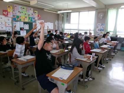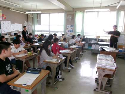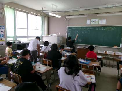 長方形の面積と直方体の体積を求める問題に挑戦していました。ただし,それぞれの辺の長さが分数になっています。分数でも整数と同じように,縦×横,あるいは縦×横×高さで面積や体積が求められることを確認した後,分数同士のかけ算に取り組んでいました。