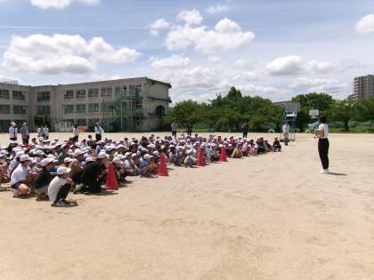 子どもたちは,しっかり口をハンカチで押さえながら,グランドの集合場所におよそ3分で避難することができました。