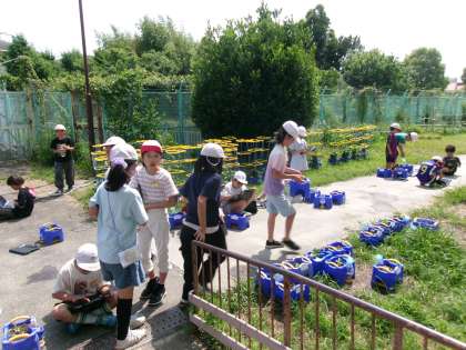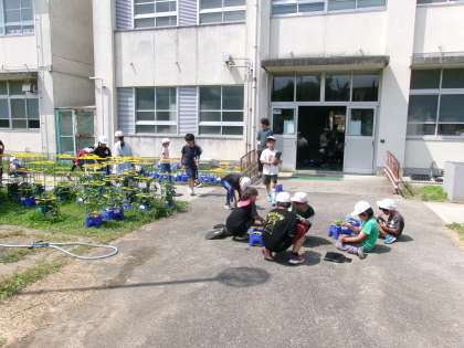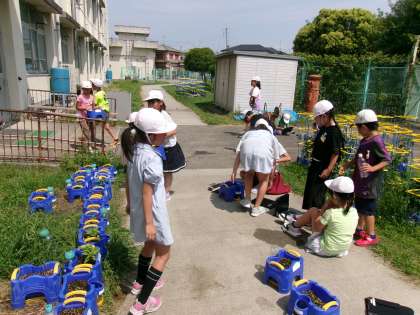 ホウセンカの観察をしていました。植木鉢に植えたホウセンカの成長の様子を,タブレットの写真機能で撮影し,教室に持ち帰って特徴を見つけていきます。