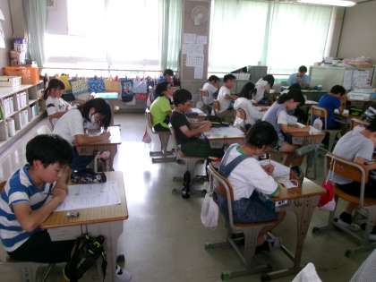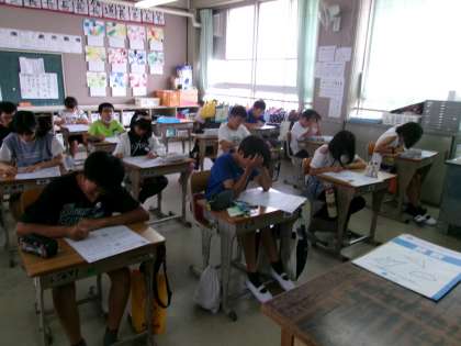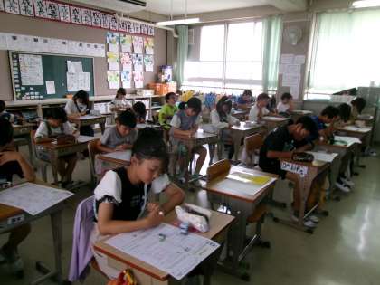 小数のかけ算のテストをしていました。みんな真剣にテストに取り組んでいます。