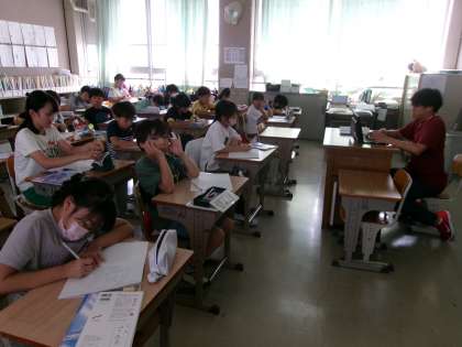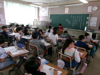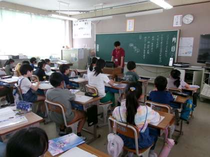 「アップとルーズで伝える」という説明文の学習をしていました。今日は,まとめの段階で,自分の好きな教科について,みんなの前で発表する原稿づくりに挑戦しています。まずは,自分が発表しようと思う教科を中心に,イメージマップを作って書く内容を考えました。次に,担任が作ったお手本の文を,子どもたちに紹介していました。