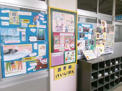 図書室前の様子です。司書の先生が,いろいろと工夫して課題図書や新刊の本の紹介などをしてくださっています。