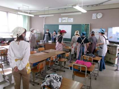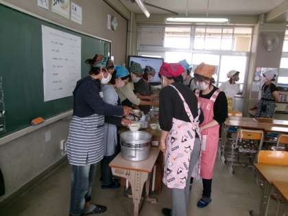コロナで当面の間中止していた給食試食会ですが,今年度から復活しました。今日は希望された保護者の方に,給食当番の体験もしていただきながら試食会を行いました。まずは栄養教諭から給食についての簡単な説明があり,その後給食当番を体験しました。