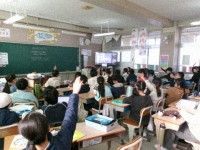 総合的な学習で「防災」についての授業をしていました。いろいろな防災グッズの中で,3つだけ持ち出せるとしたら何を選ぶかを,班で話し合っていました。