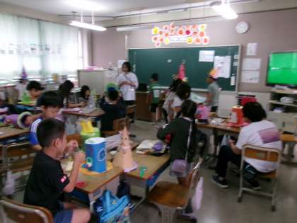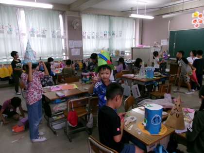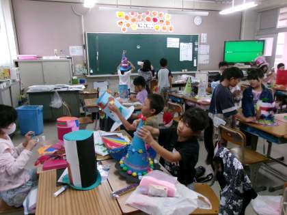 今日は,完成した帽子をかぶっていました。まだ少し飾りをつけたい子は,飾りをつけてかぶっていきます。この後,一人ずつ写真を撮るそうです。