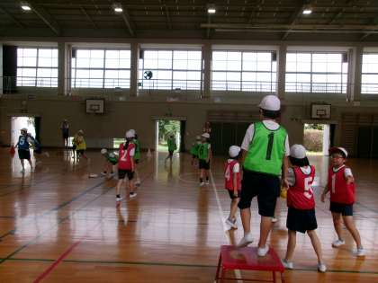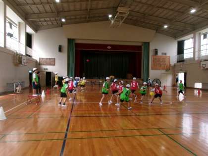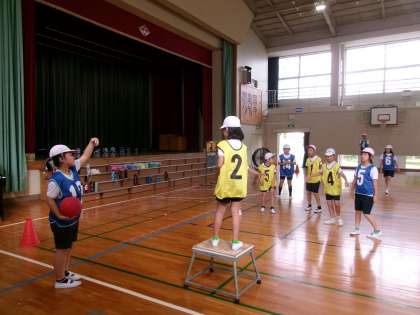 体育館でポートボールの試合をしていました。上手にドリブルをしたりパスをしたりしながら,工夫してシュートにつなげていました。