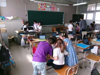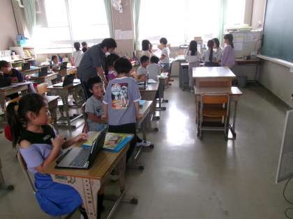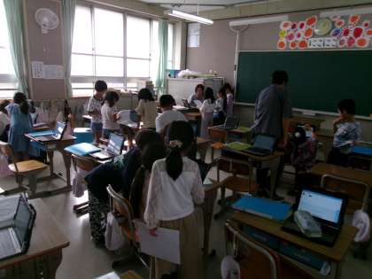 町探検のまとめを作っていました。タブレットを活用して,町探検で撮った写真などを貼り付けながら,説明の内容を考えていました。