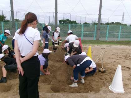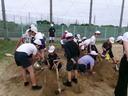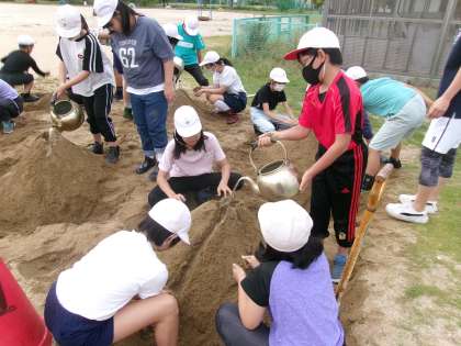 「流れる水のはたらき」という単元で,実際に砂場で実験していました。砂で山を作り,やかんの水を山の上から流していきます。どのように砂が削られていくかをしっかり観察することができました。