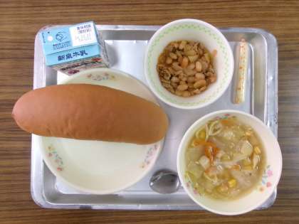 今日のメニューは,コッペパン,マカロニスープ,チリコンカン,スティックチーズでした。
