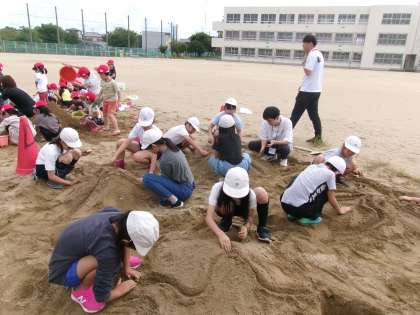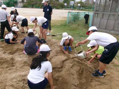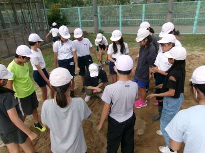 「流れる水のはたらき」という単元で,2組も実際に砂場で山を作り,やかんで水を流して実験していました。1回実験した後,石を自分の家に見立てて,自分だったらどこに家を建てるか石を置かせてから,再度水を流して試していました。