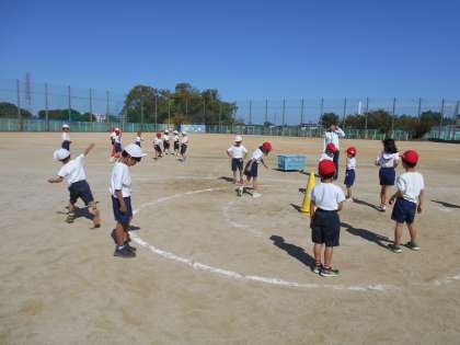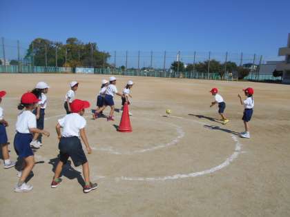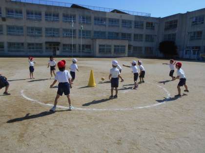 今日の体育は,ボール遊びでした。円の中心のカラーコーンにボールを当てると得点です。カラーコーンの周りには,相手チームの子たちがいるので,その子たちを避けながら当てるのは難しいのですが,何とかコーンに当てることができていました。