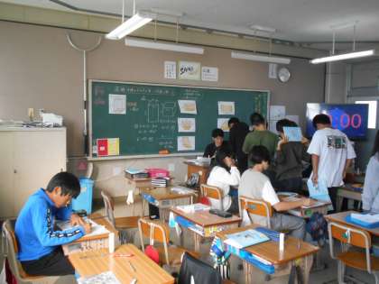 いろいろな形の体積を求める問題に挑戦していました。直方体や立方体だけでなく,凸凹がある形など,2つに分けてたし算したり,形が直方体と仮定して計算してからひき算したりしながら問題を解いていました。