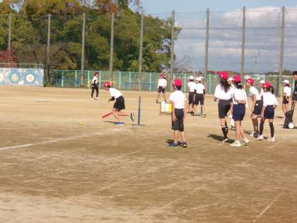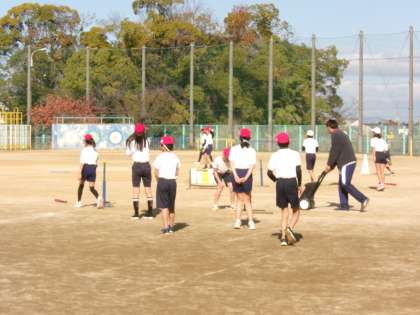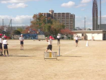 ティーボールの試合をしていました。ルールを少し工夫して,みんなが参加しやすい方法で試合を行っています。