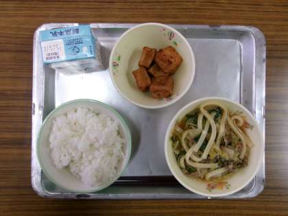 今日のメニューは,ごはん,すき焼きうどん,厚揚げのしょうが焼きでした。