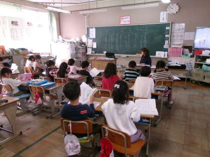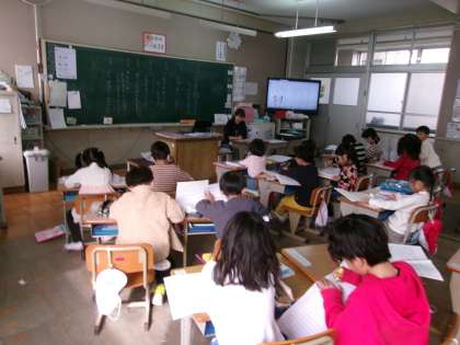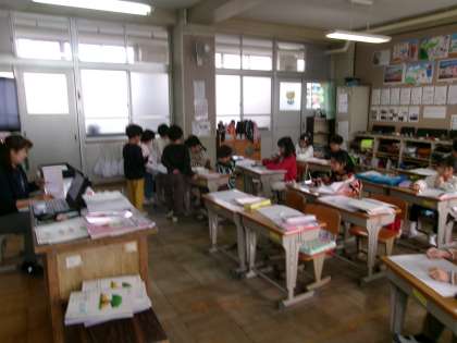 絵本などでお話の書き方を確かめた後,自分でお話を作っていました。「 」でセリフを表すことなどに注意しながら,教科書の絵を見てオリジナルのストーリーを考えています。