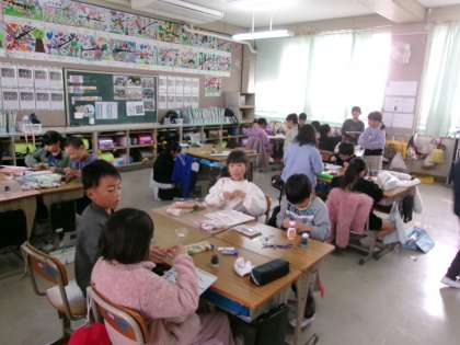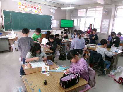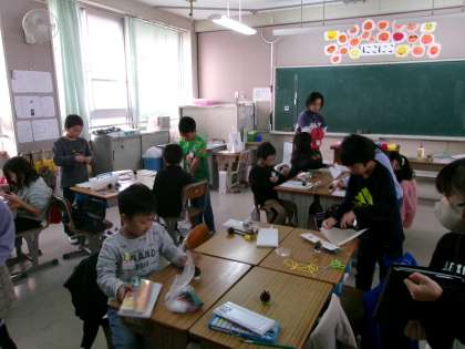 2組もまつぼっくりとペットボトルのキャップを使ったミニツリーを作っていました。まつぼっくりに色を塗ったり飾りをつけたりしながら,ツリーに仕上げていきます。完成が楽しみです!