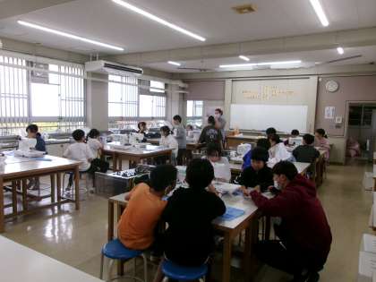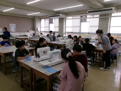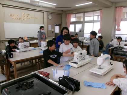 5年生では,初めてミシンを使った学習をします。まず,ミシンの各部の名称や使い方について説明を聞いていました。