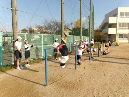 鉄棒に挑戦していました。足かけあがりです。先生がお手本を見せた後,お互いに声をかけ合いながら練習していきます。