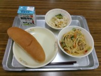 今日のメニューは,ミニコッペパン,じゃこと小松菜のスパゲティ,花野菜のマヨネーズ...
