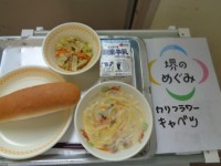 栄養教諭の先生が、今日の大おかずの食材を持ってきてくれました。「キャベツ?」「白...