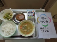 ・牛乳・ごはん・さつま汁・照り焼きハンバーグ・小松菜と白菜の炒め煮 「さつま」と...