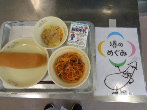 今日は,ミートスパゲティに堺市産のなすをいれました。