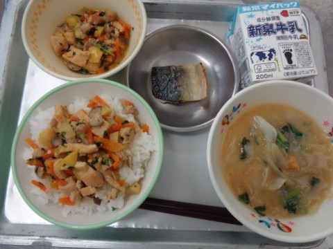 今日の給食に登場するきのこや栗,さばも秋の食材です。秋の食材を食べて,季節を楽しみましょう。
