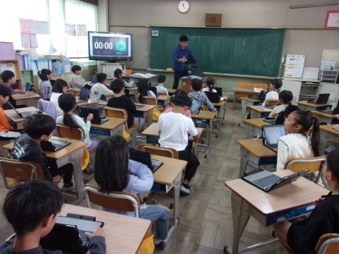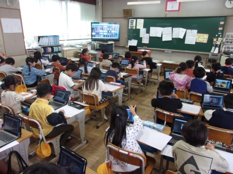 1年生は図工で、『どうぶつとなかよし』の学習をしていました。校外学習で動物園に行ったことをもとに、タブレットでさまざまな動物を調べながら、自分が描きたいイメージを膨らませていきました。