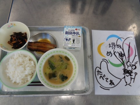 今日は,みそ汁に入っている「小松菜」が堺のめぐみです。