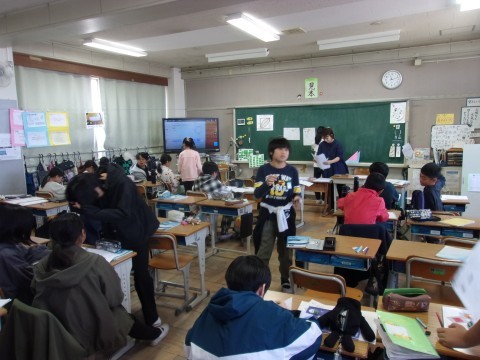 1組は算数で、円の面積のまとめの練習問題に取り組んでいました。できた人から答え合わせをして確認していきました。