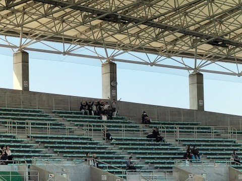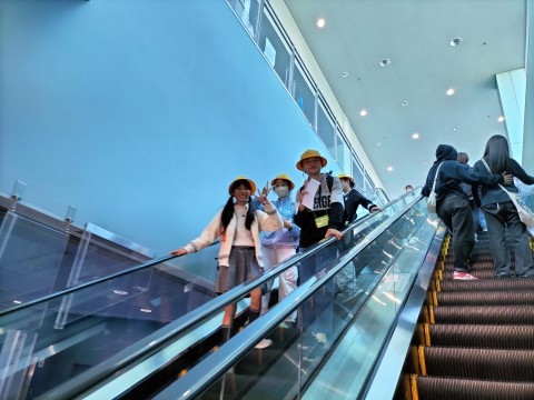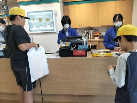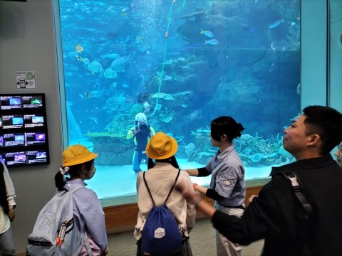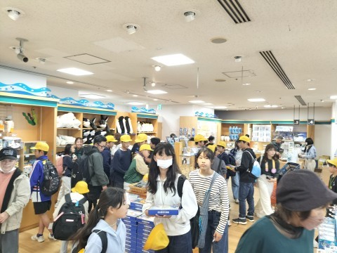 イルカショーの時間までグループで自由に見学しています。買い物を楽しんだり、ダイバーさんに質問したりと、思い思いに過ごしています。