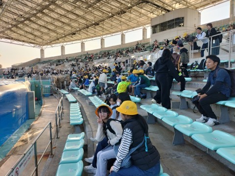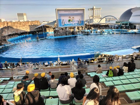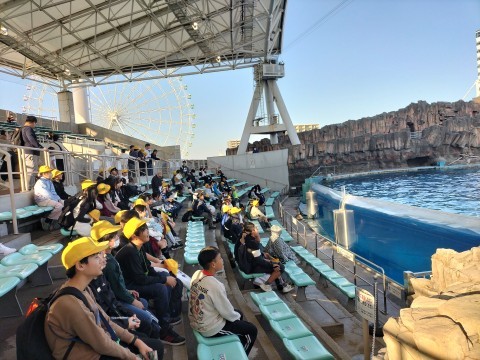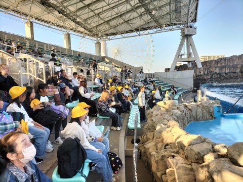 館内の見学を終え、イルカショーが始まりました。飼育員さんにイルカの生態や進化の歴史を教えていただきました。