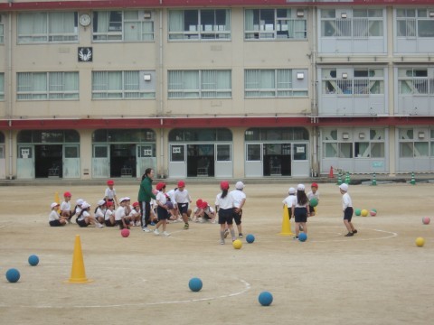 1組は体育で、サークルシュートゲームをしていました。いい動きの例を先生が示しながら、よりよく得点ができるよう考えながら動いていきました。