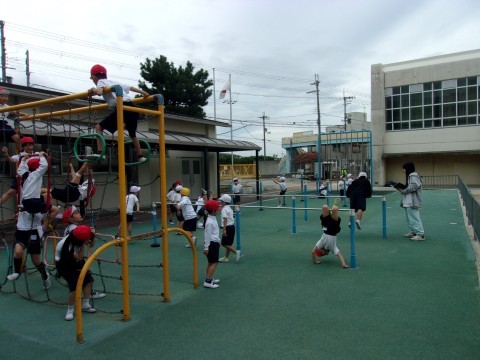 2組は体育で、鉄棒に取り組んでいました。先生にできるようになった技を見てもらいながら、自分の課題ができるようにしっかりと練習しました。