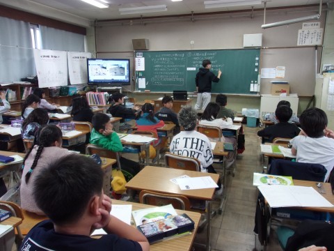 4組は理科で、どうして影の向きが変わるのかについて考えました。太陽の位置が変わるから、時間によってかわる、太陽の動きに秘密がありそう、などの意見が出ました。