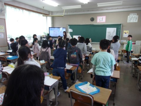 2組は算数で、かけ算の練習プリントに取り組んでいました。3×5の式になる問題を完成させるために穴埋め問題に取り組むなど、意味を考えて解答していきました。
