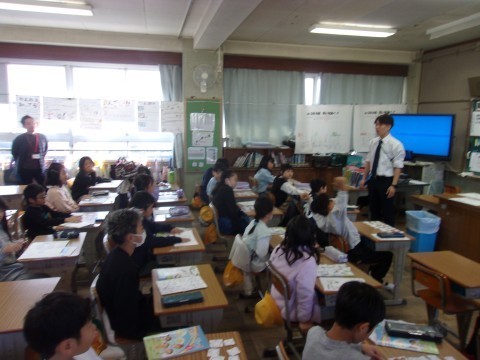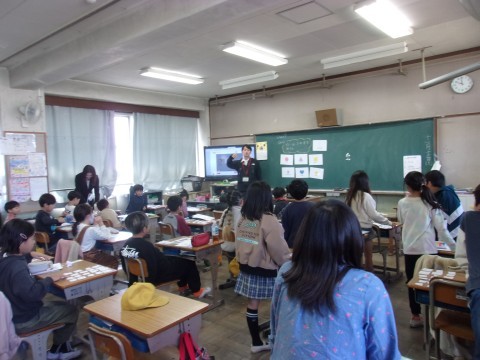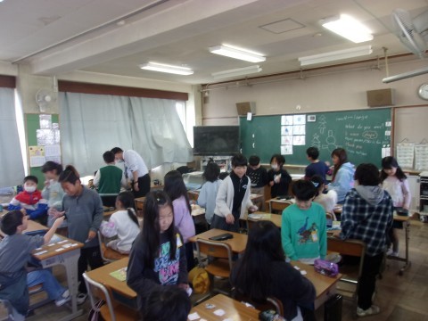 2,3,4組は外国語で、グリーティングカードを作成していました。☆、□、〇等の形を表す英語を唱えながら形を集めて作成していきました。