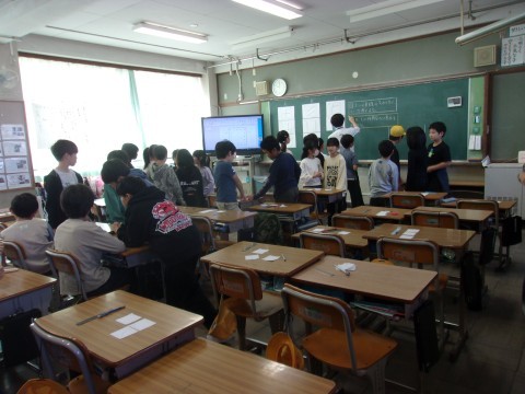 1組は算数で、二つの直線の交わり方について考えていきました90度に交わる垂直や、永遠に交わらない平行を学習しながら分類していきました。