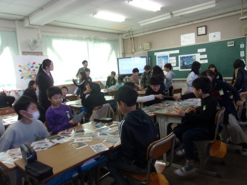 2組は図工で、アートカードを用いながら、絵やもののいろいろな見方について学習していきました。絵画の特徴をとらえながらグループで楽しんでいきました。