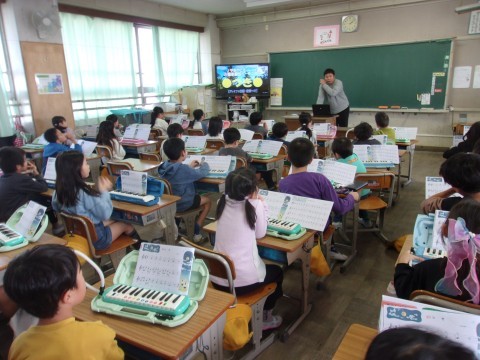 2組は音楽で、『つき』の演奏をしていました。伴奏に合わせて月の感じを思い浮かべながら、まーるい漢字になるように弾いていました。
