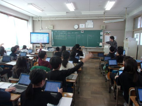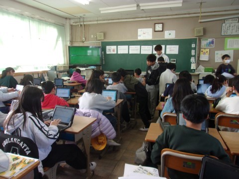 2組は国語で、全国の伝統工芸品からテーマを決めて、その工芸品の良さが伝わるリーフレットを作成していました。具体例を挙げる言葉などを使いこなしていきました。