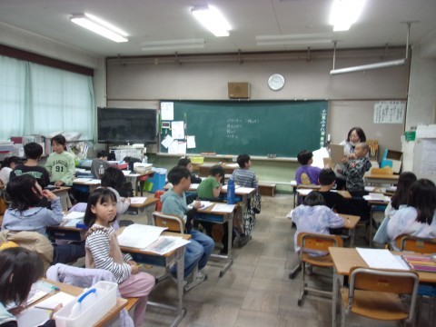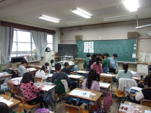 3組は外国語活動で、グリーティングカードを作成していました。○、△、☆等の形を英語で表現して、その形を集めて楽しいカードに仕上げていきました。