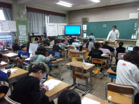 1、4組は図工で、『くぎうちビー玉ゲーム』の作成に取り組んでいました。まずはボードの絵に取り掛かりました。タブレットも活用しながら楽しそうな絵を描いていました。
