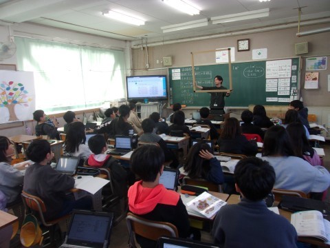 2組は算数で、教室や理科室の面積を求めていきました。先生が1㎡の模型を示すと、思ったよりも大きくて驚いた様子でした。量感は大切ですね。