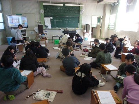 3組は音楽で、 『さくら さくら』の音階で旋律をつくっていきました。グループに分かれて話し合い、試しながら進めていきました。