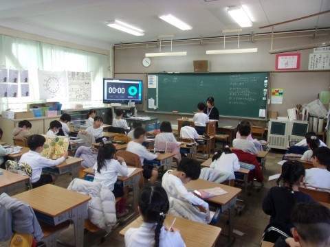 1組は国語で、『たぬきの糸車』の役割分担を決めていました。先生からどのように発表すればよいのか説明を受けました。みんなやる気満々です。