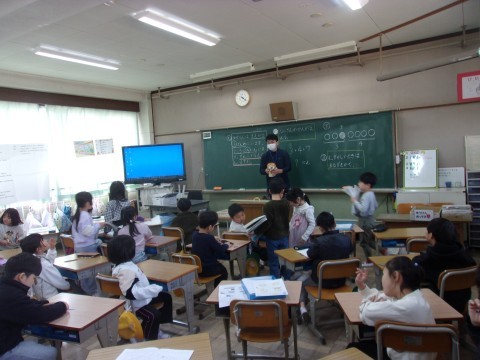 3組は算数で、ライオンのライくんが前から3番目にいて後ろに4人並んでいると全部で何人になるかを考えました。