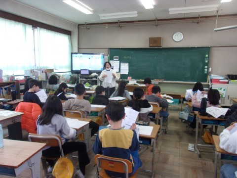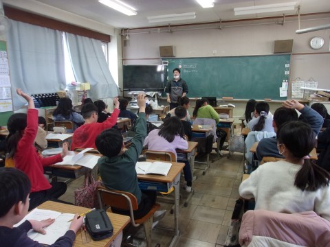 3組は社会で、堺市の昔と今について学習していました。泉北ニュータウンのできた背景や歴史について学習したことを発表しながら復習していました。