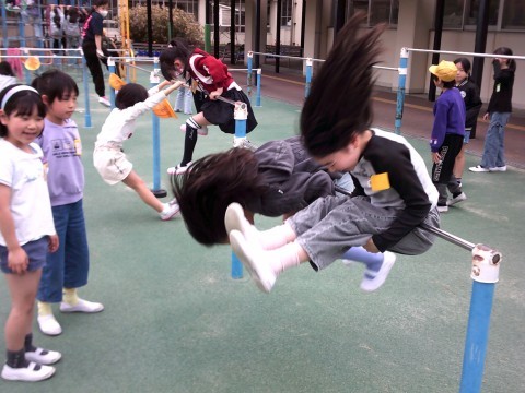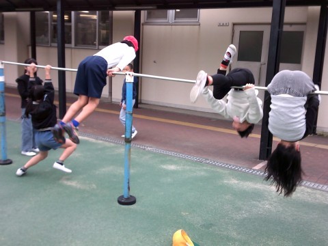 20分休憩に運動場に出てみると,鉄棒や上り棒で遊んでいるこどもたちがたくさんいました♪