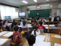 1年生が、にっこりしそうなカラフルな太陽の絵を描いていました。